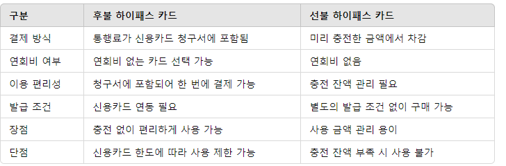 후불 하이패스 카드와 선불 하이패스 카드 비교